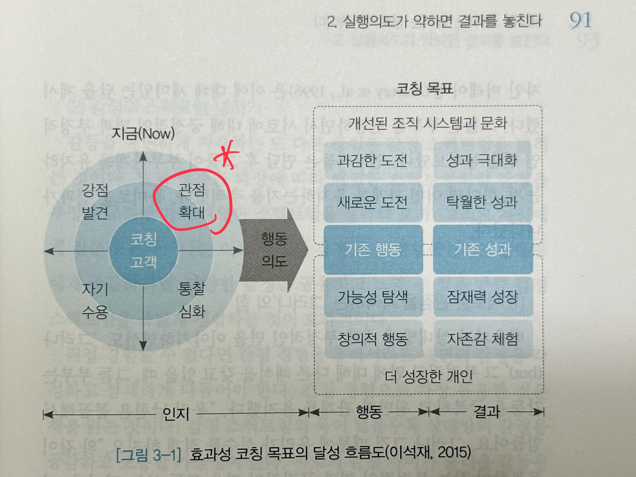1. <실행력을 높이는 코칭심리학 수업> (이석재, 2024)에 소개한 효과성 코칭 목표의 달성 흐름도를 보면(91쪽), 관점 확대를 인지전략으로 소개했습니다. 코칭이 효과적이려면 코칭 고객이 지금 여기에서 생각하는 내용이 행동으로 연결되어야 하죠. 현실에서 생각과 현실을 연결하는 것은 쉽지 않죠.