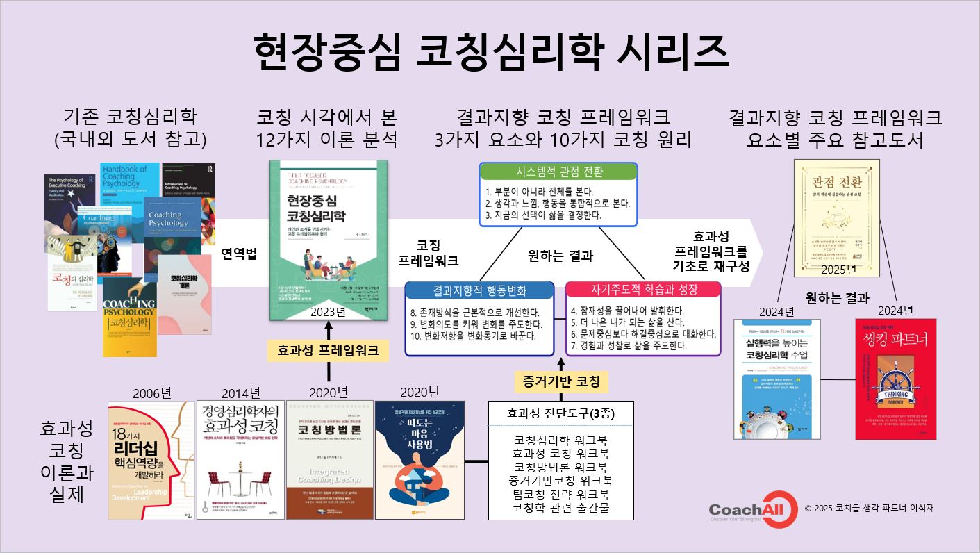 <Field-Oriented Coaching Psychology> Series "The answers lie in the coaching field." If you ask about the path to establishing coaching studies, I believe the answers lie in the coaching field itself. Of course, a deductive approach is also necessary. I've placed a greater emphasis on inductive approaches and strived to find answers to the emerging field of coaching. The <Field-Oriented Coaching Psychology> series captures the research efforts of our thought partners over the past 23 years. I express my deepest gratitude to everyone who has supported us.