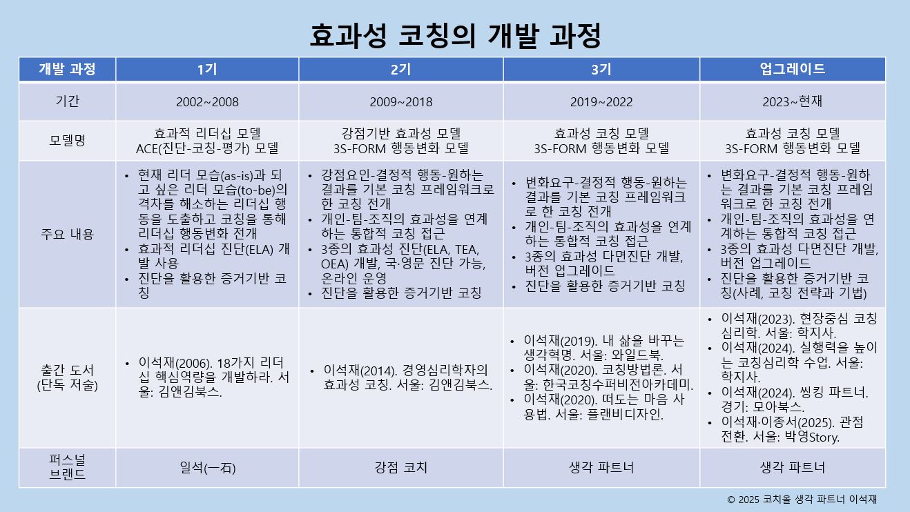 이석재(2020.5). 효과성 코칭 방법론: 개발, 적용과 과제. 한국코칭학회, 25차 춘계학술대화, 주제발표.